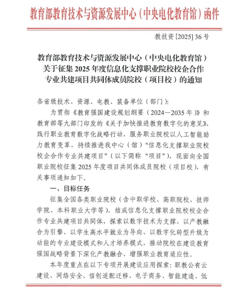 關(guān)于征集2025年度信息化支撐職業(yè)院校校企合作專業(yè)共建項(xiàng)目共同體成員院校(項(xiàng)目校)的通知
