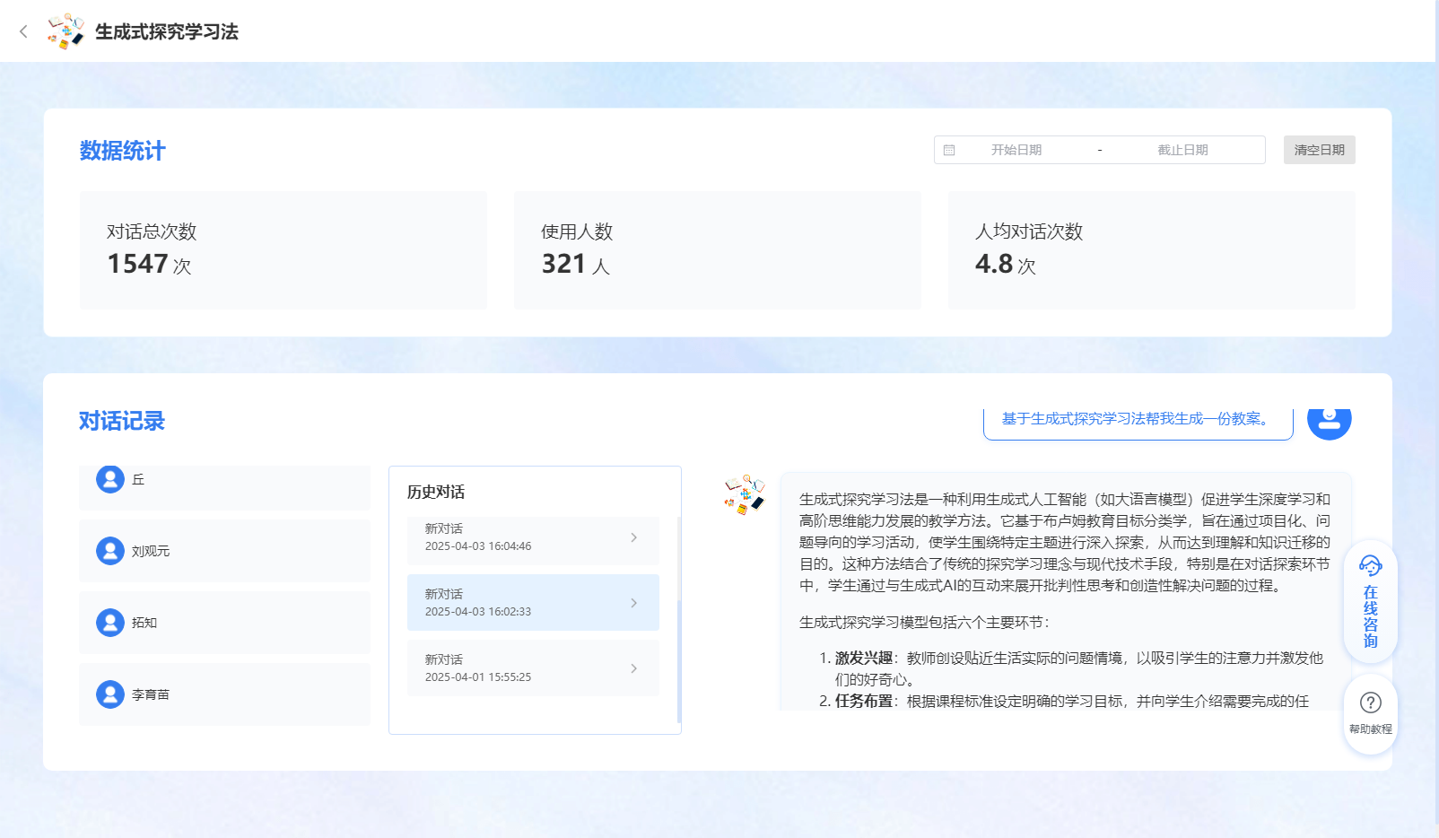 教師可以利用平臺(tái)的智能體,輔助開展頭腦風(fēng)暴、分組討論等活動(dòng),激發(fā)學(xué)生的思維活力;根據(jù)學(xué)生能力差異提供針對(duì)性教學(xué)方案,滿足不同學(xué)生的學(xué)習(xí)需求;為學(xué)生創(chuàng)造情景模擬學(xué)習(xí)環(huán)境,比如模擬病人讓醫(yī)學(xué)生進(jìn)行問診實(shí)踐,讓學(xué)生在實(shí)踐中提升知識(shí)運(yùn)用能力,使課堂教學(xué)更加生動(dòng)有趣、富有成效。
